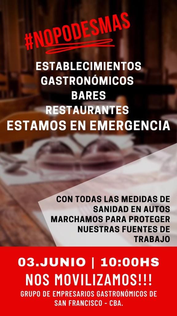 Los propietarios de bares, comedores y restaurantes convocan a una manifestación para el próximo miércoles 3 de junio a las 10 con el fin de reclamar la apertura de sus locales comerciales.